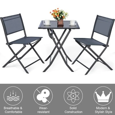 This is our 3 pieces table and chairs set. It has one folding table with 2 chairs. It will bring new life to your patio or deck with the table and chairs Set. Its durable, and steel textilene frame provides a sturdy foundation for this delightful set. With its glass tabletop and stackable chairs, the Table furniture set is the perfect way to enjoy a cafe-style experience right outside of your door. And it will be simple for storage and transport for their folding feature. You can put it in your garden, patio or pool side as you want.