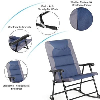 The combination of 2 rocking chairs and 1 glass coffee table can make a great addition to your patio or deck. Unlike ordinary chairs, our chairs come with added rocking feature can provide you with more relaxed experience. Solid steel construction and premium PVC fabric ensure long lasting durability. The coffee table comes with tempered glass is perfect for holding drinks or wine. The thick padded cushion, backrest and headrest offer optimum comfort. Equipped with locking pins, the chairs will be more stable to ensure your safety during using. Because of the folding design, our rocking chairs and table can be stored in any compact place when not use. You can also bring this outdoor furniture set with you when you go out for camping. This fabulous folding rocking chair and table set will make your outdoor life more relaxed and enjoyable.