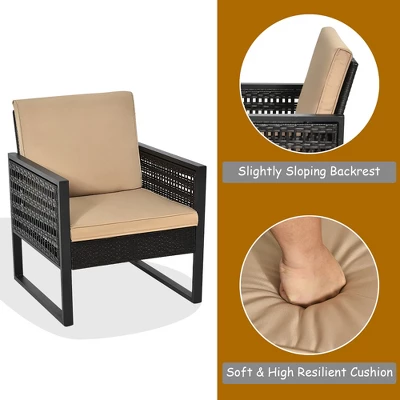 Costway 3PCS Patio Rattan Bistro Furniture Set Cushioned Sofa Chair Coffee Table Garden