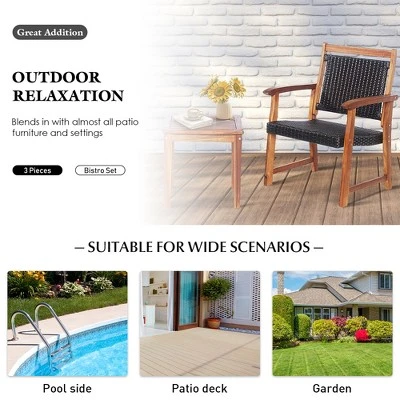 Combining natural wood elements with PE wicker, this patio conversation set intrigues a pastoral appeal, suitable for poolside, garden, park, and more. Solid hardwood material forms a strong structure for chairs and tables while the PE wicker guarantees a breathable seat and backrest. This bistro set creates leisure and intimate spot with 2 comfortable seats and a side table. Besides, it is easy to assemble the chair set if you follow the instructions correctly.
