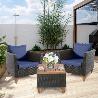 Strong metal frame has rust-resistance and high strength functions, giving you enough security. Made of premium acacia wood, the legs of 3 pieces and the tabletop are sturdy and built-to-last. The back cushions and seat cushions, which padded with thick sponges, are comfortable and soft, offering you wonderful sitting experience. They are easy to maintain that you can remove the covers of cushions by unzipping when they need to be cleaned. The rattan sofa set perfectly suits a variety of indoor and outdoor occasions, such as balcony, yard, patio and so on. What are you waiting for? Our 3-piece sofa set is perfect for you!