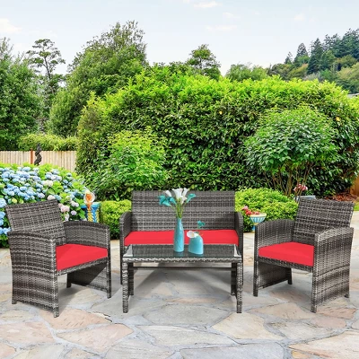 Rattan patio set includes one loveseat, two single chairs and one coffee table.