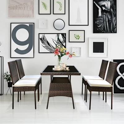 Enjoy your dining time with your family members and friends. Our 5pcs rattan dining set including 1 table and 4 chairs is modern and practical, which can perfectly meet your needs. The soft cushion is tightly fixed on the rattan chair by straps and it can be conveniently removed. The cover of cushion is removable with the smooth zipper. And the premium steel frame and durable PE rattan can support heavy weight. Coming with an easy-to-clean tempered glass tabletop and weather-resistant rattan surface, this bistro set is suitable for outdoor use. And the chic design is perfect for your dining room, garden, patio, poolside and porch.