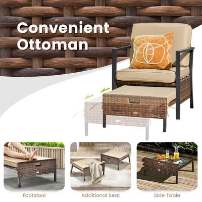 Equipped with seat cushions, back cushions and ottoman cushions, both the chair and ottomans offer you more comfort and softness. And the ottoman can be also used as an addition seat or a patio side table for more convenience. The whole set is mainly made of rustproof metal and durable PVC rattan for long-lasting service life. And the tempered glass coffee table is sturdy and easy to maintain. Furthermore, the cut-out handle of ottoman allows you to easily move the ottoman anywhere. And when not in use, the ottoman can be pushed under the chair for space saving.