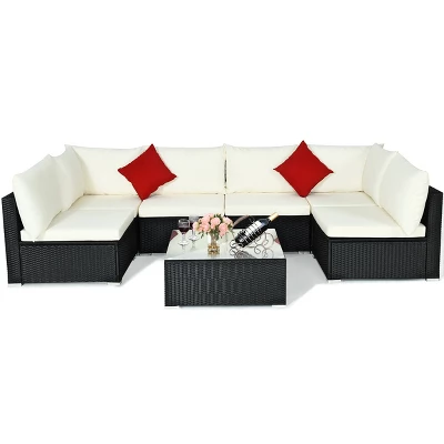 This our 7 pieces outdoor patio table chairs set. It including 2 corner sofa, 4 single sofa and 1 coffee table with glass top. This furniture set Are Of Contemporary Looks And Flavor, Offers Comfortable And Exceptionally Stunning Outdoor Lounging .It Will Be A Great Addition To Any Outdoor Living Space. The Sofa And Chairs Feature Exquisitely Woven Wicker With Gently Slopping Curves And Soft Yet Supportive Cushioning. The Seat Cushions Are Designed To Resist The Elements And Stay Beautiful Through Years Of Use. What is More The Table Features A Tempered Glass Top .It Is Perfect For The Pool Side, Deck Or Patio, These Cushioned Seats Will Let You And Your Guests To Sit Back, Relax And Enjoy The Great Outdoors.