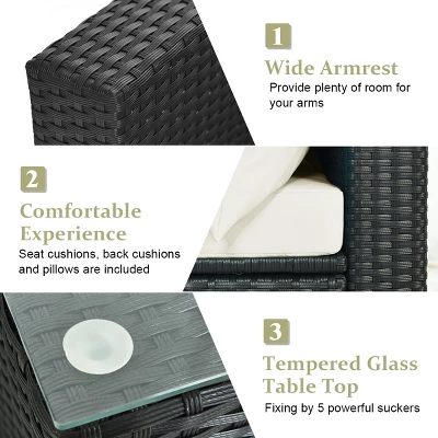 - Modern Style with Coffee Table: Modern wicker furniture set combines outstanding quality and chic appearance, and make it great for your patio, garden, backyard and poolside. Besides, functional coffee table has durable tempered glass top which is fixed by 5 powerful suckers to offer space for drinks and books.