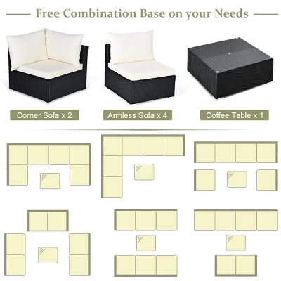 Our premium 7-piece patio furniture set comes with 4 armless sofas, 2 corner sofas and a coffee table, so you can flexible combination based on your needs and room space. Made of superior steel and water-proof PE rattan, the patio furniture set has a long lifetime as well as large weight capacity. Besides, thick seat cushions, back cushions and pillows for extra cozy. Besides, the seat cushions have removable and washable cover for easy cleaning. Coffee table with tempered glass top is durable and functional. It is a great additional to your patio, garden, backyard, pool and other space.