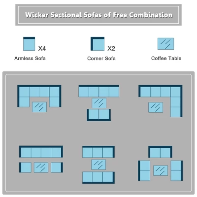 - 7 Piece Sectional Sofa Set: The patio sectional sofa set includes 4 armless sofas, 2 corner sofas and 1 coffee table, which provide plenty of seats for enjoying leisure time with your friends. Because the sofas are individual, you can you can freely combine them according to your needs. We prepare furniture clips to prevent your wicker furniture from sliding.