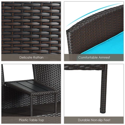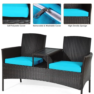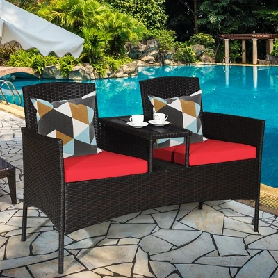 Enjoy outdoor leisure time with this patio conversation set. Featuring rugged structure and high-quality PE rattan, this patio furniture set is built to stand up to harsh weather conditions and great for outdoor using. In addition, this patio loveseat set comes with a coffee table between 2 seats that provide enough space for books and cups. And this patio loveseat sofa set is more practical than traditional loveseat sofa and more space-saving than 3-piece patio furniture set. Besides, wide armrest and curved backrest ensures you will love the comfortable feel of the patio conversation. The thickly cushioned patio sofa set chairs for maximum comfort and excellent seating experience. By the way, this conversation is easy assembly.