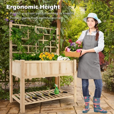- Spacious Planting & Storing Space: The elevated garden bed is designed with a large & deep plant box to cultivate flowers, vegetables, herbs, fruits, and a bottom shelf that is reserved for tool storage. Moreover, the heightened trellis is designed for cultivating climbing plants.